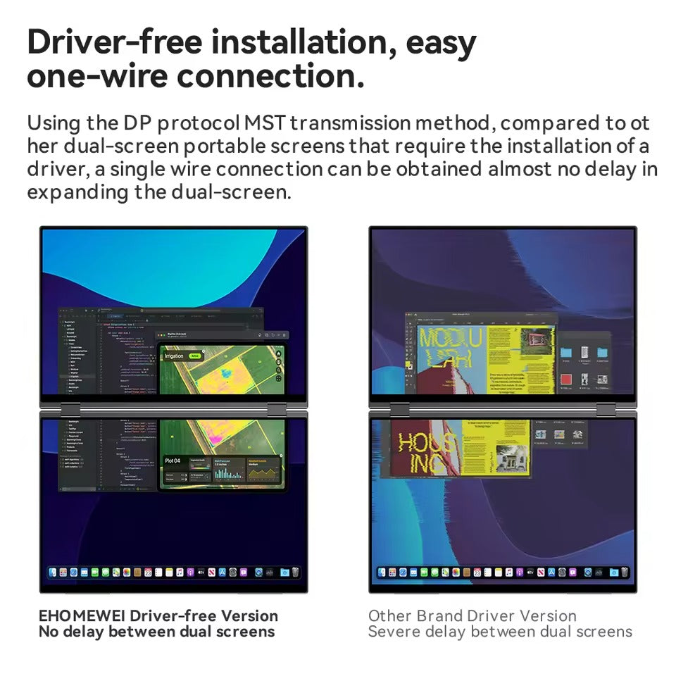 Enhance your productivity with the EHOMEWEI Dual Screen Portable Monitor X2 Pro. This 16-inch, 2K resolution display offers crisp visuals and seamless touch functionality without the need for additional drivers. Compatible with Windows laptops and MacBooks, it provides an intuitive phone-touch interface for effortless control. Its lightweight, portable design makes it ideal for professionals on the go, delivering extended screen space to streamline multitasking and improve workflow efficiency.